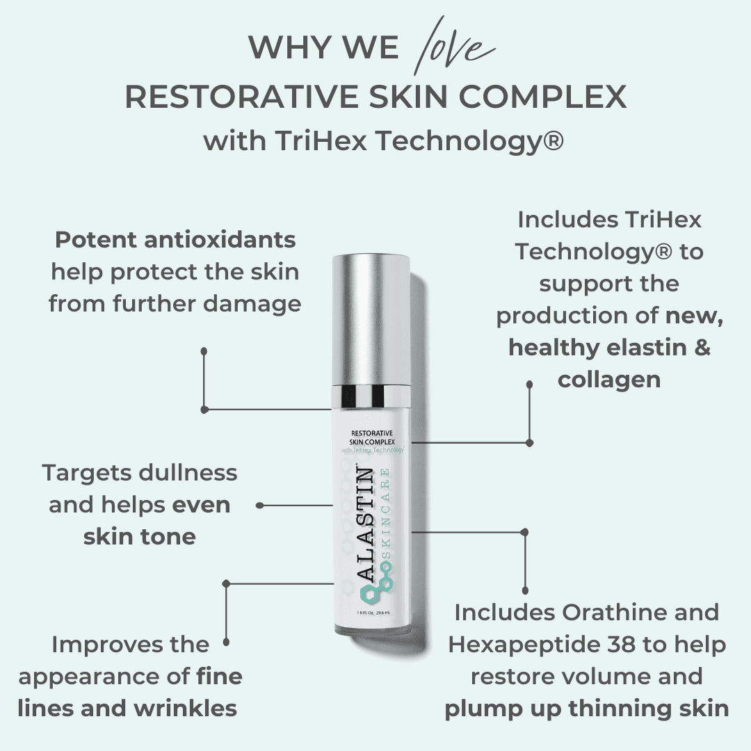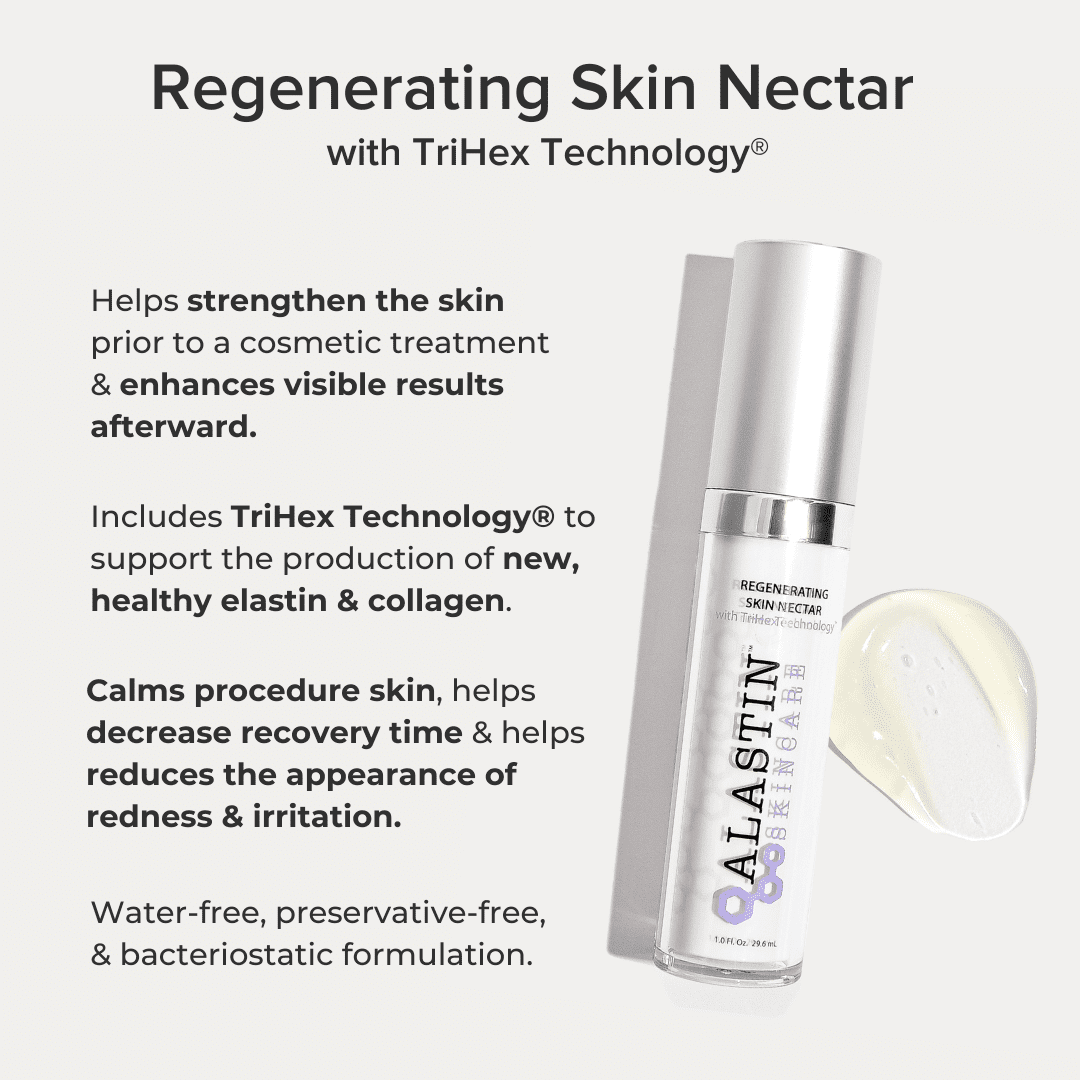 ALASTIN Skincare is a complete rejuvenation approach that helps to combat the appearance of fine lines, wrinkles and other visible signs of aging.  Both their Daily Restorative Skincare and Procedure Support Skincare products are powered by TriHex Technology. TriHex Technology is a proprietery and clinically-proven technology that supports the production of fresh collagen and elastin, helping to protect and renew skin for a more youthful appearance. It is a proprietary blend of active peptides and botanicals specifically engineered to work with the skin to help clear out damaged elastin and collagen and support the skin’s natural ability to produce new elastin and collagen. Continued use of ALASTIN Skincare supports this sequence to maintain smoother, healthier, more youthful-looking skin every day. Backed by science with proven results via clinical studies.